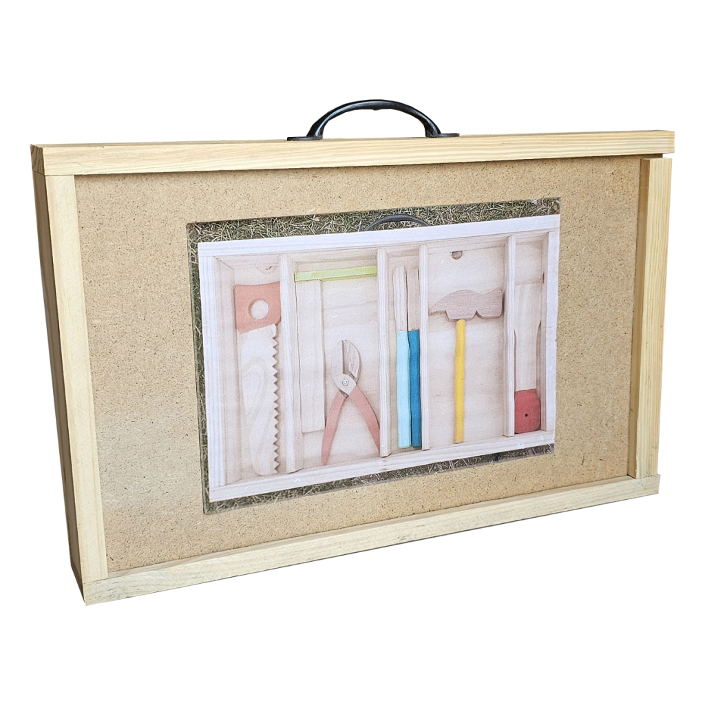 Caja de herramientas para jugar. La misma tiene manija y la tapa es corrediza.